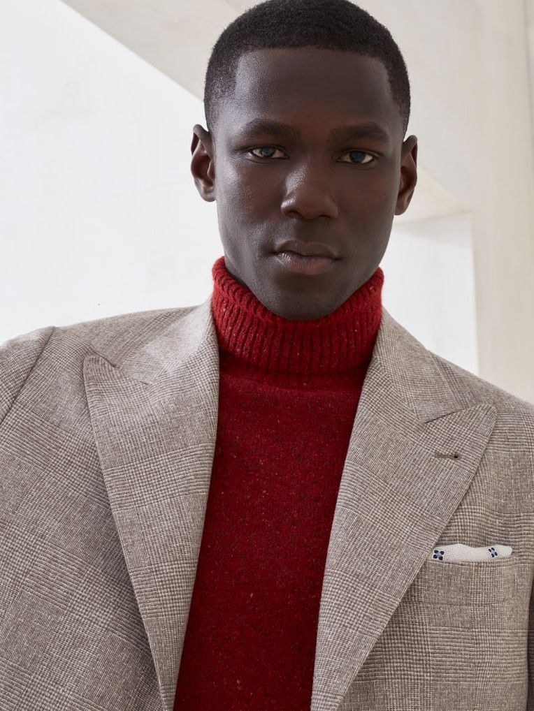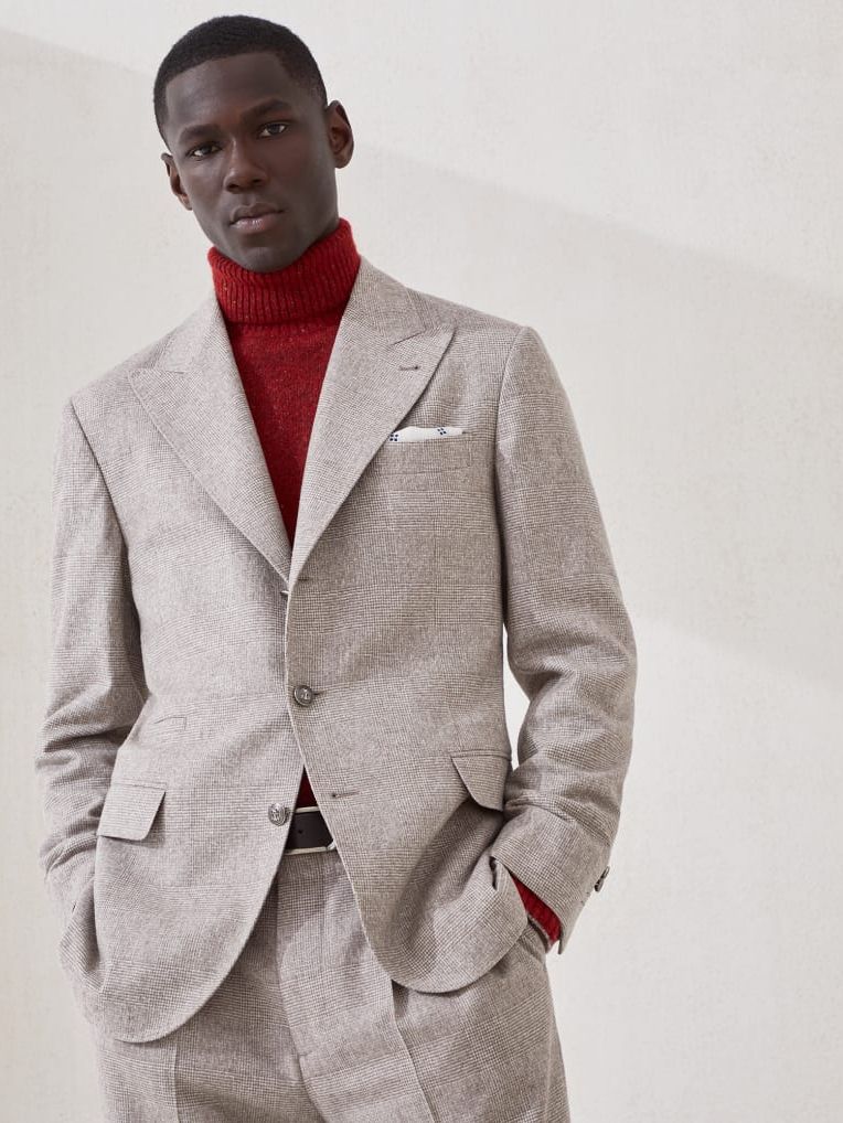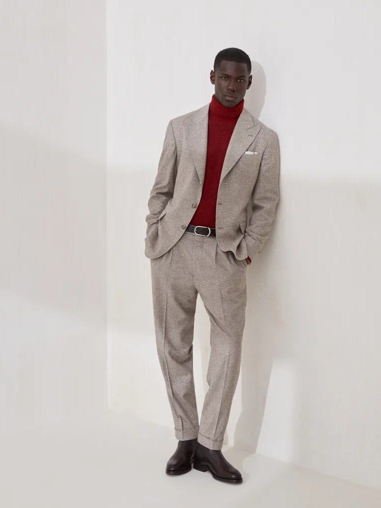 실의 자연스러운 경량감이 돋보이는 이 수트는 큼직한 피크 라펠과 메탈 버튼으로 강렬하면서도 현대적인 실루엣을 완성합니다. 실크, 울, 캐시미어가 조화롭게 어우러져 탄생한 밝고 가벼운 프린스 오브 웨일스 플란넬에, 도네갈 원단 특유의 다소 불규칙한 색감이 고급스러운 포인트를 더합니다. 회사가 자리한 마을의 이름을 딴 'Spalla Solomeo'는 Brunello Cucinelli 자켓만의 독창적인 비율을 강조합니다. 슬림하면서도 견고하게 다듬어진 어깨선은 어깨 패드를 사용하지 않고도 단정하고 우아한 남성 체형의 실루엣이 돋보이게 합니다.