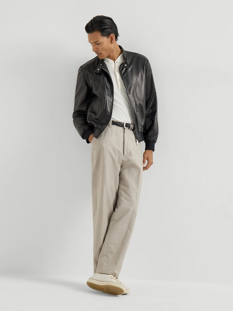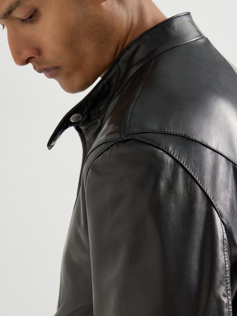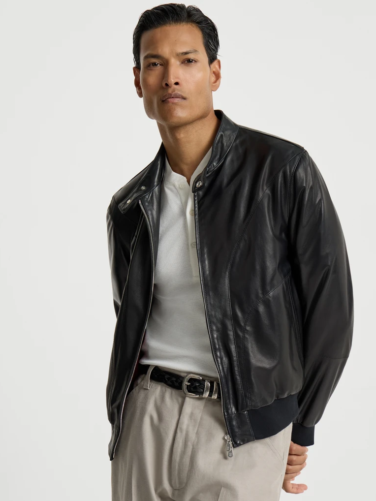 캐주얼한 애티튜드와 세련된 소재가 조화를 이룬 아우터로 현대적이면서도 유행을 타지 않는 스타일을 연출할 수 있습니다. 스냅이 달린 클래식한 칼라가 특징인 이 파일럿 재킷은 엄선된 나파 가죽으로 제작되어 광택이 나고 부드러운 촉감을 선사합니다. 실루엣이 부드럽고 편안한 볼륨감을 제공하며 측면의 골지 밴드가 강조되어 있습니다.