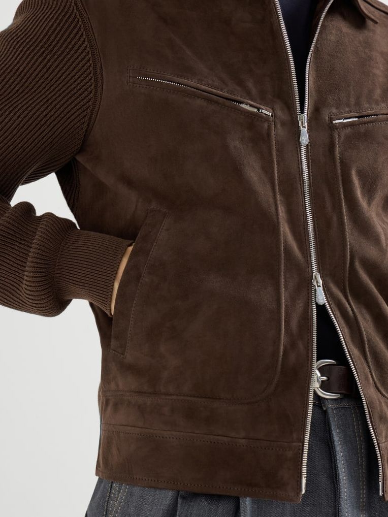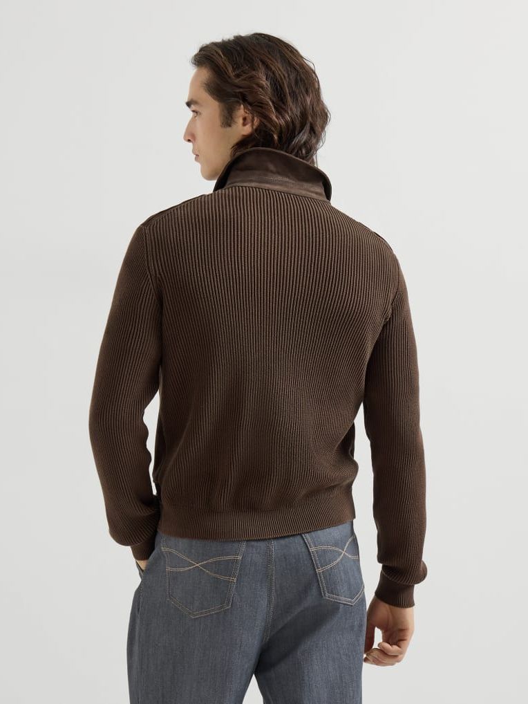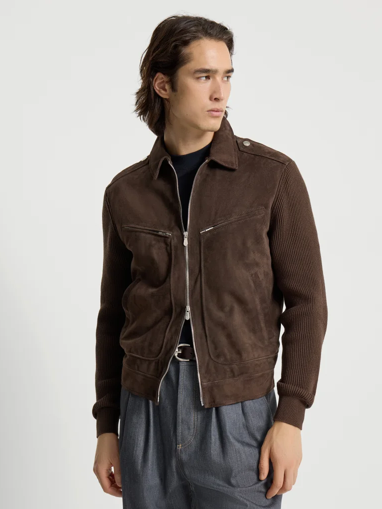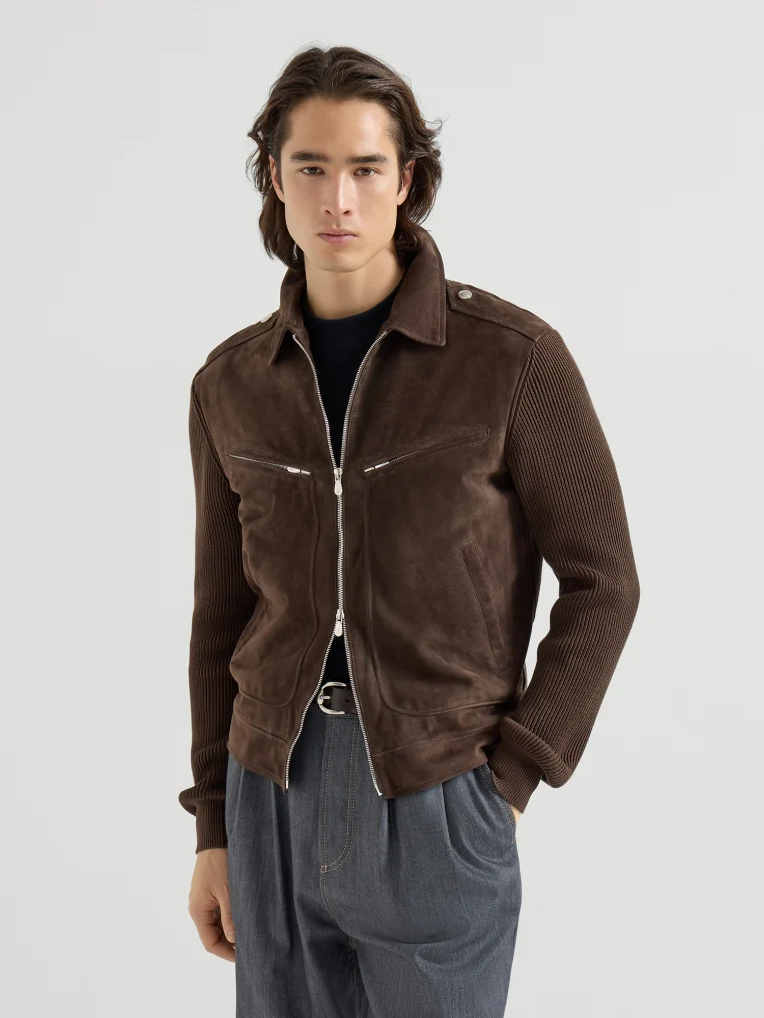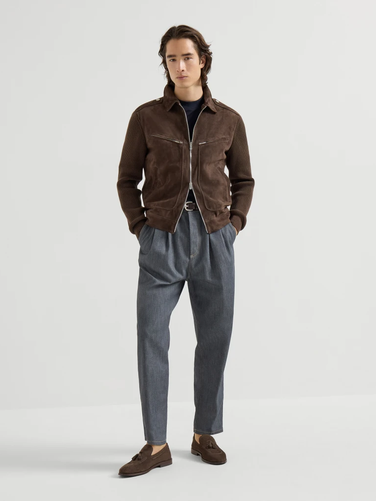 브루넬로 쿠치넬리 MPCLF2077 에스프레소 스웨이드 & 코튼 니트 블루종