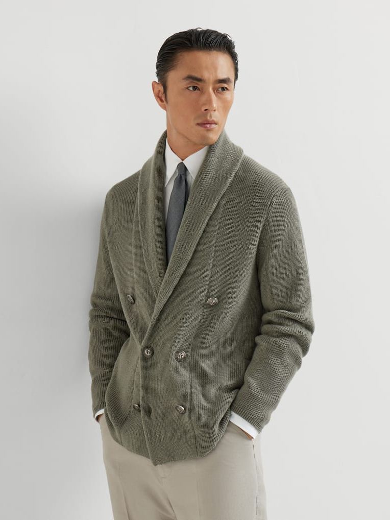 레트로 영감, 천연 원사, 장인의 장인 정신이 숄 칼라와 메탈 버튼이 돋보이는 세련된 스타일의 코튼 니트 카디건을 정의합니다. 부드럽고 섬세한 촉감의 코튼 섬유가 클래식한 하프 잉글리시 립 니팅으로 실루엣을 부드럽게 감싸줍니다. 어깨까지 레귤러 핏으로 떨어지는 디자인으로 몸통에 편안한 비율을 제공합니다.