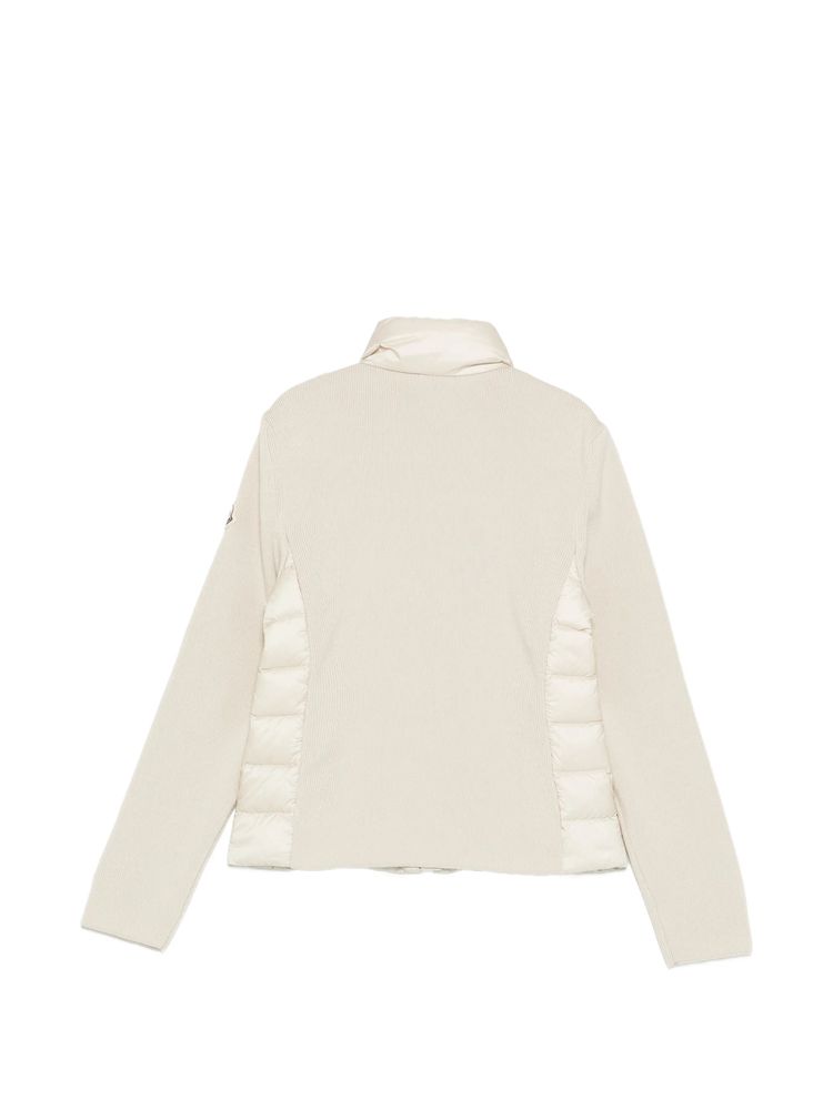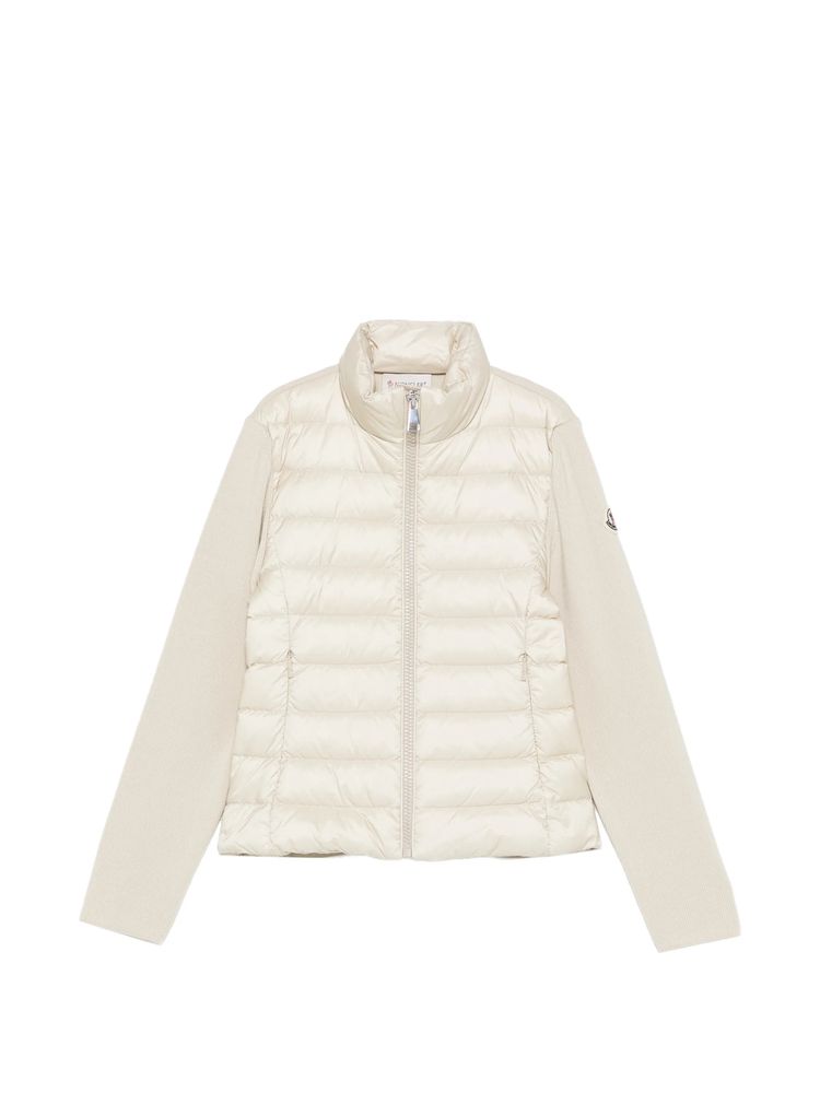 • 베이지 퀼팅 프론트 리브드 디자인 로고 패치 집 패스닝 롱 슬리브