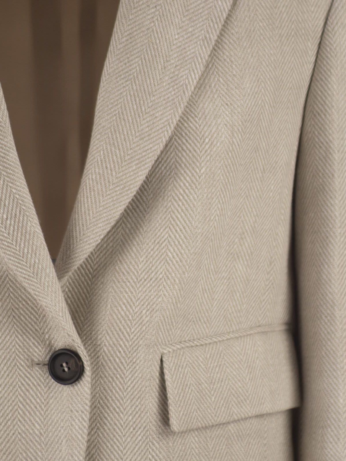 • 테일러링에서 영감을 받은 현대적 감성이 리넨과 코튼 셰브론 크롭 자켓의 스타일을 정의합니다. 클래식한 남성 우아함의 코드를 여성스럽게 재해석하여, 원단의 신선함과 크롭 컷으로 강조된 여름스럽고 자유로운 감성의 아이템을 완성했습니다. 목 뒤쪽에는 고급스러운 모닐레 자수가 돋보이며, 순수한 Brunello Cucinelli 스타일의 예상치 못한 포인트로 자켓을 완성합니다.