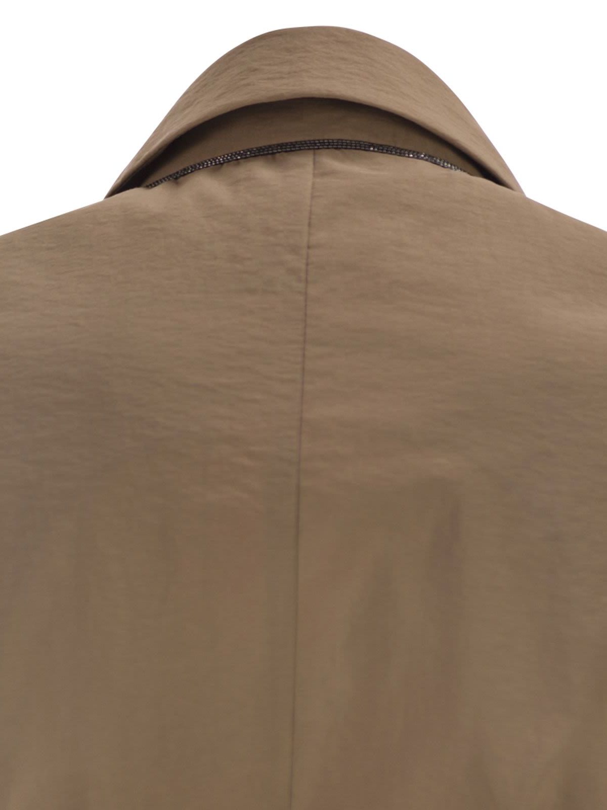 • 가벼운 테크노 코튼 포플린은 Brunello Cucinelli 컬렉션의 클래식 원단입니다. 합성 섬유의 존재는 텍스처의 약간 불규칙한 효과를 보존하는 데 기여합니다. 혼방 실크 크레이프 안감이 착용감의 편안함을 완성합니다.